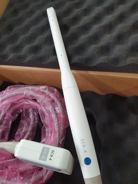 Siemens Acuson’s EC9-4 curved array endocavitary convex array ultrasound probe transducer. This ultrasound probe, also known as an endovaginal probe, specializes in women’s health applications. Included in these applications is the ability to produce urological and OB-GYN images. It had a frequency range of 4 – 9 MHz.